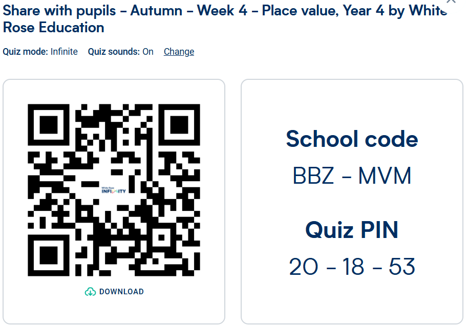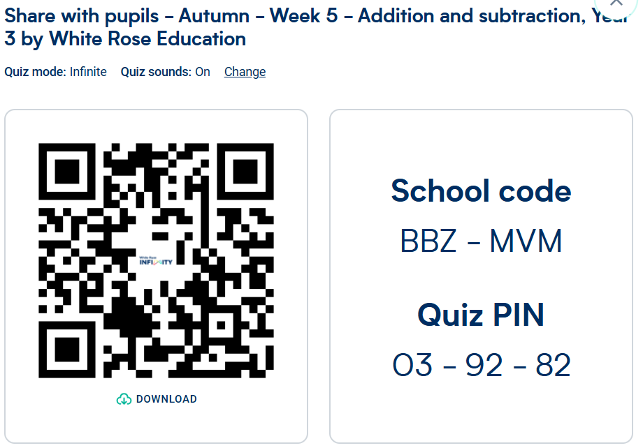 Maths: Children will need to either use the White Rose Infinity app (free to download) or use their website: White Rose Infinity to access the weekly quizzes set each week.